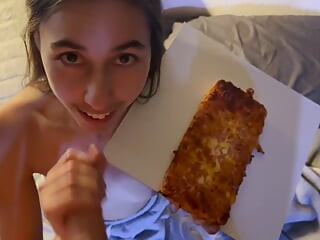 我可爱的女友为披萨卷吮吸我的鸡巴